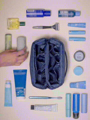 A removable divider, outfitted with multiple pockets and pouches of varying sizes, keeps your complete range of tubes and bottles neatly organized, while leaving ample space in the open compartments to accommodate bulkier items. A padded zip pocket at the center offers extra protection.